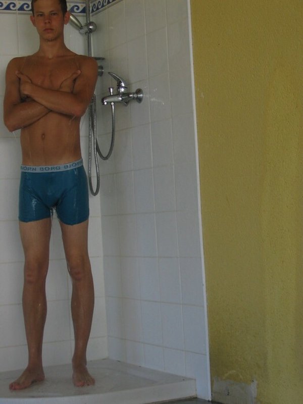 guys are taking a shower without removing the pants