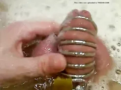Boy in chastity cums