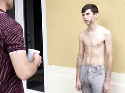 Handsome twink jerks off and shoots a massive load on his attractive friend’s face.