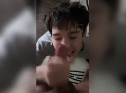 Young Twink On A Bed, Jerks Off And Cums in His Own Mouth Good Spurts Of Sperm ... .